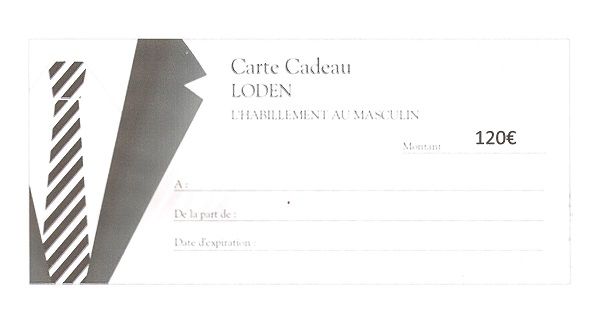 Carte Cadeau D’une valeur de 120€ valable sur toute la boutique. Une carte cadeau vous sera renvoyée avec un ticket code barre servant de titre de paiement. Ce titre de paiement sera valable 6 mois à compter de la date indiqué sur le ticket code barre
