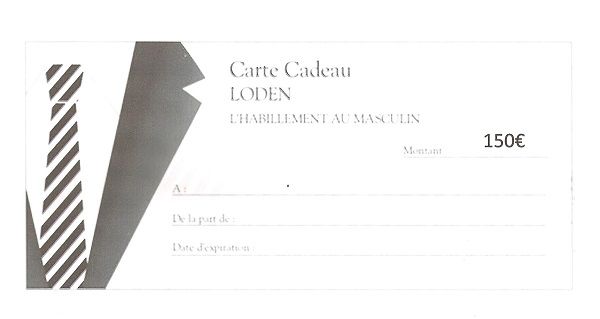 Carte Cadeau D’une valeur de 150€ valable sur toute la boutique. Une carte cadeau vous sera renvoyée avec un ticket code barre servant de titre de paiement. Ce titre de paiement sera valable 6 mois à compter de la date indiqué sur le ticket code barre