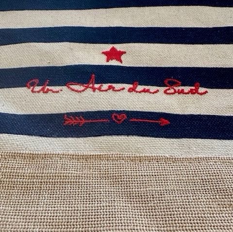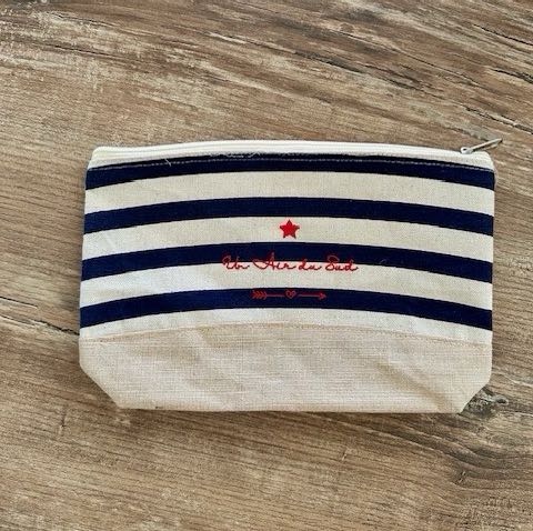 Pochette rayée ecru et bleu marine avec zip de fermeture. Dimension : L27,5 x H18 x P6 cm