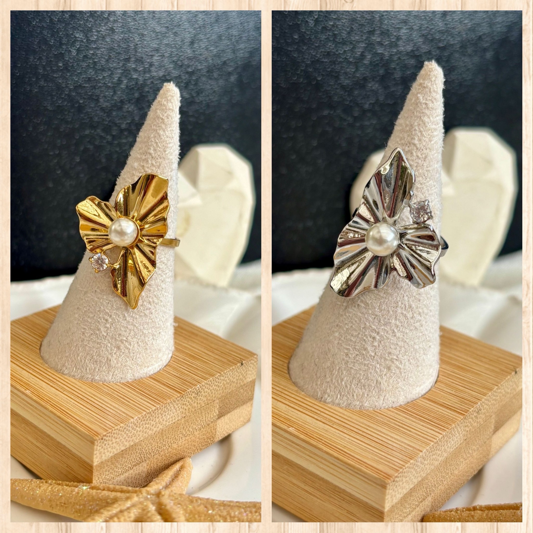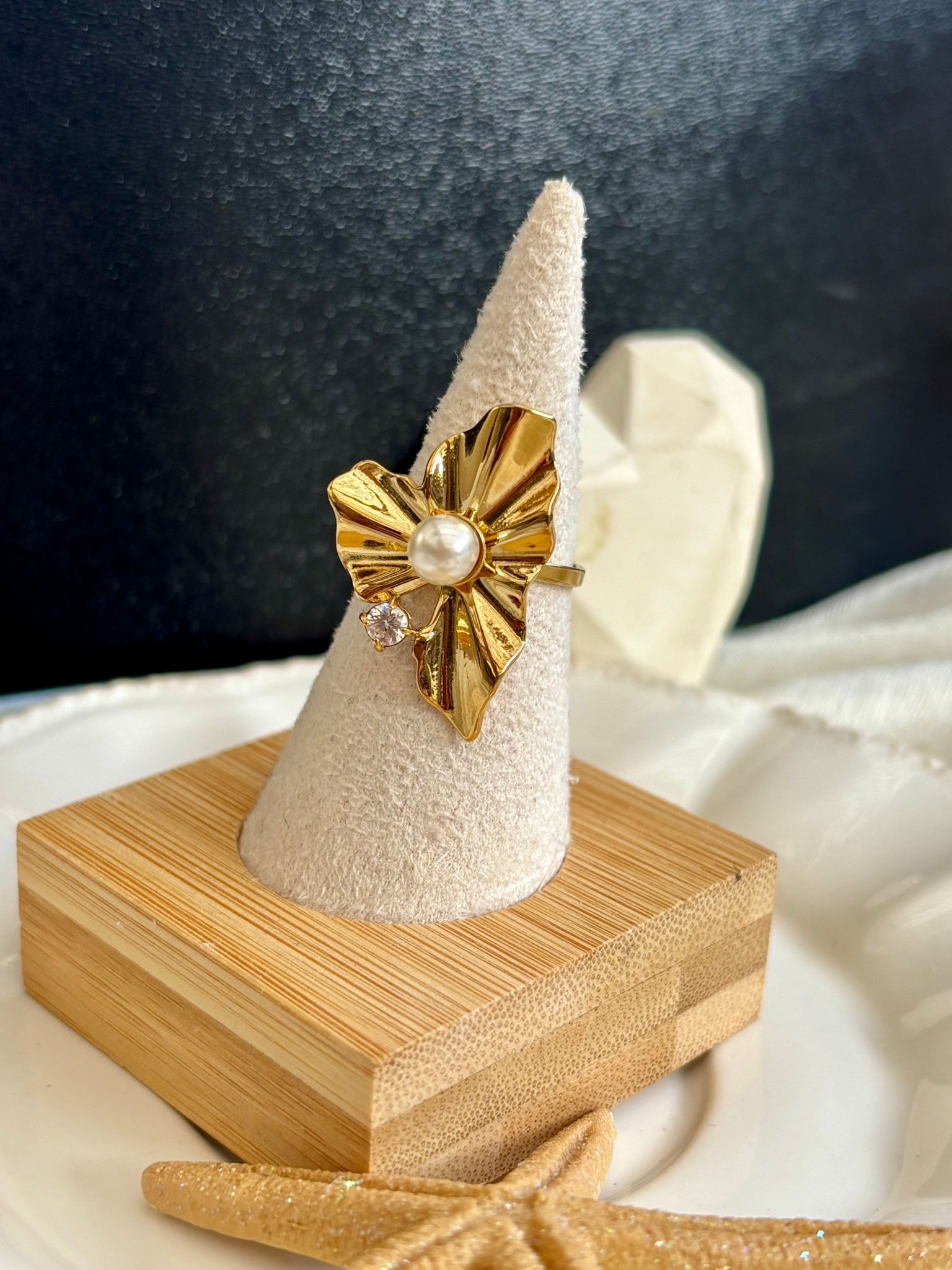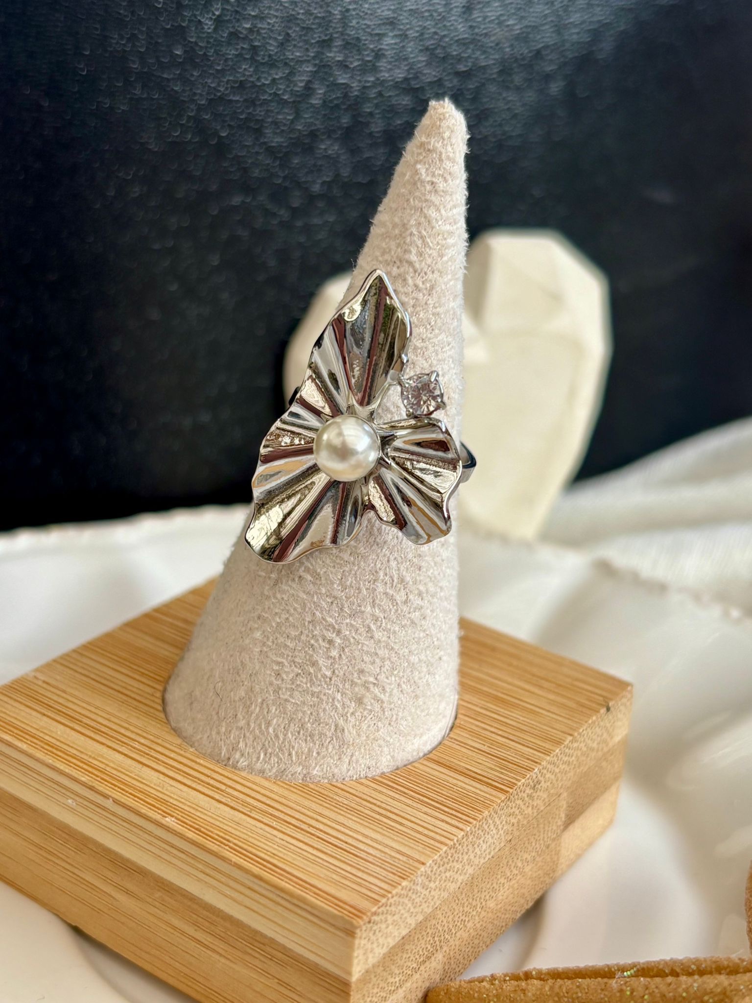 Bague reglable esprit feuille avec perle blanche et strass