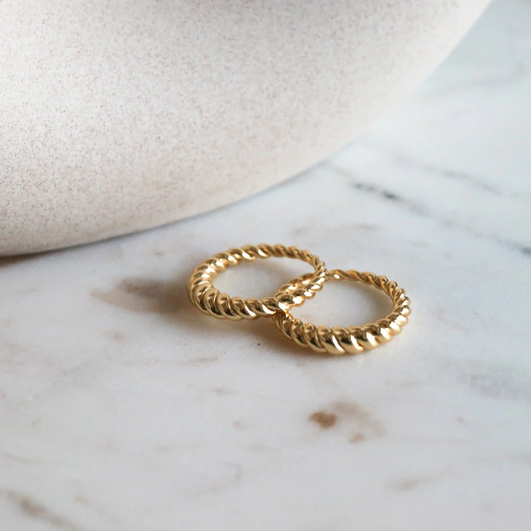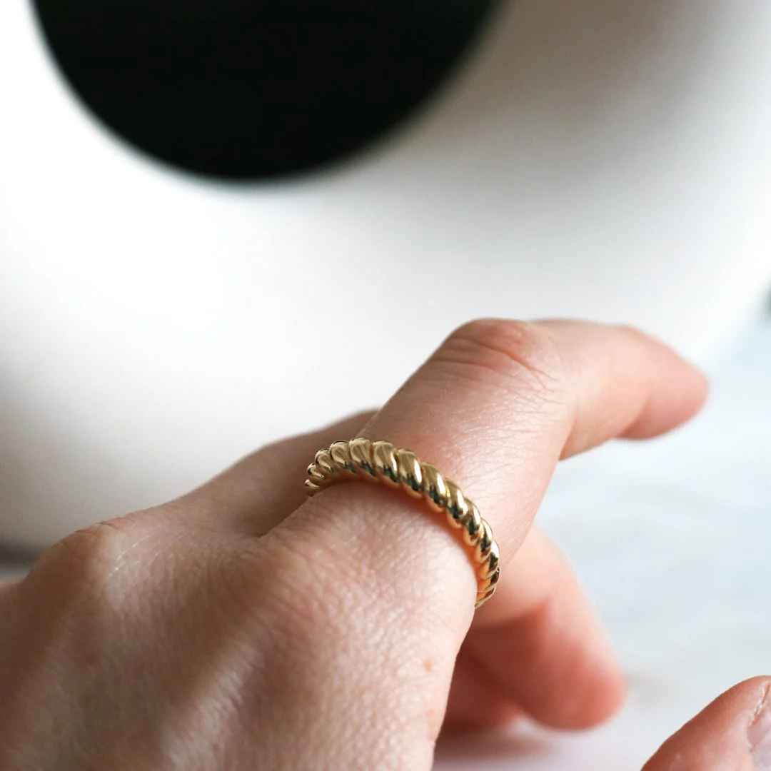Bague en argent sterling .925 plaquée or 18k torsadée à look croisant. Épaisseur de 4 mm. À porter seule ou à agencer avec une autre de nos bagues Résistante à l’eau, ne ternit pas * Cette bague est légèrement plus grande.