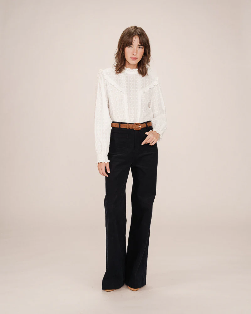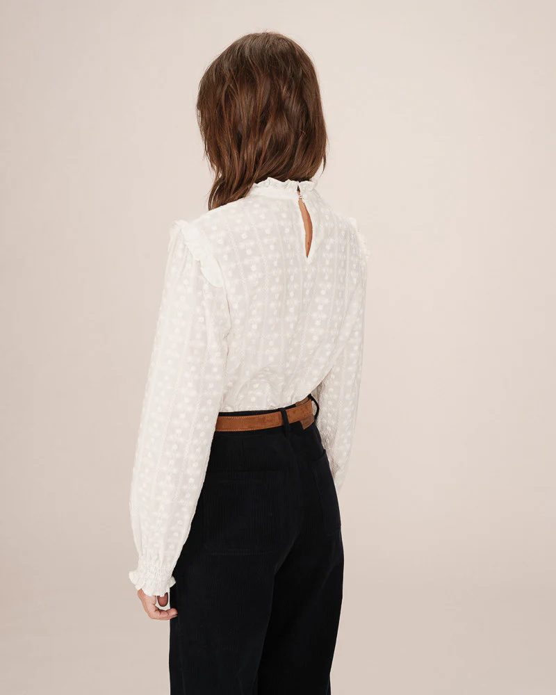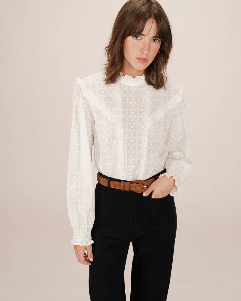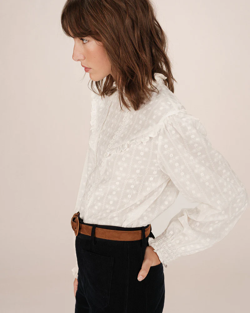 La blouse en coton SÉDUISANTE est une pièce féminine et élégante sublimée par des détails soignés. Les volants sur le devant et les poignets smockés dessinent une silhouette classique et intemporelle. Le modèle est rehaussé par une encolure ronde et une ouverture en goutte boutonnée au dos.