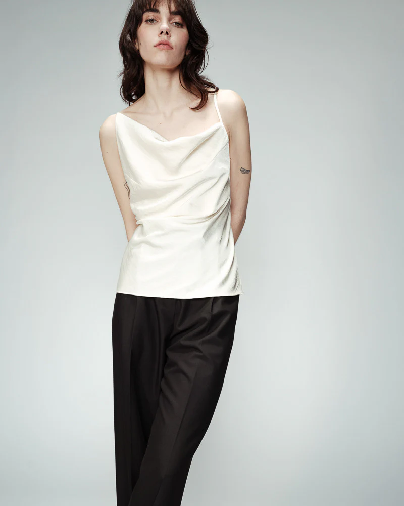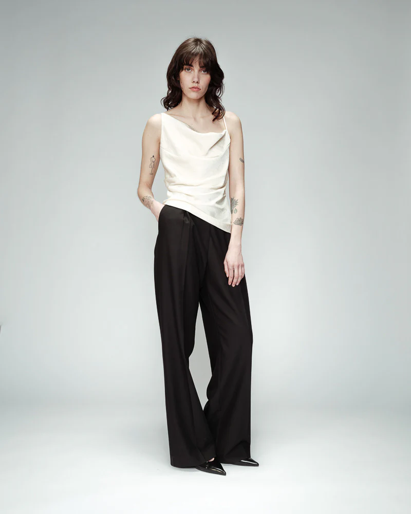 Le top asymétrique OWEN est confectionné dans un tissu satiné qui dessine une silhouette élégante et féminine. Le col bénitier et l’asymétrie du modèle créent un effet drapé et subliment le décolleté. Le top drapé OWEN ajoute à la collection une pièce féminine et sophistiquée.