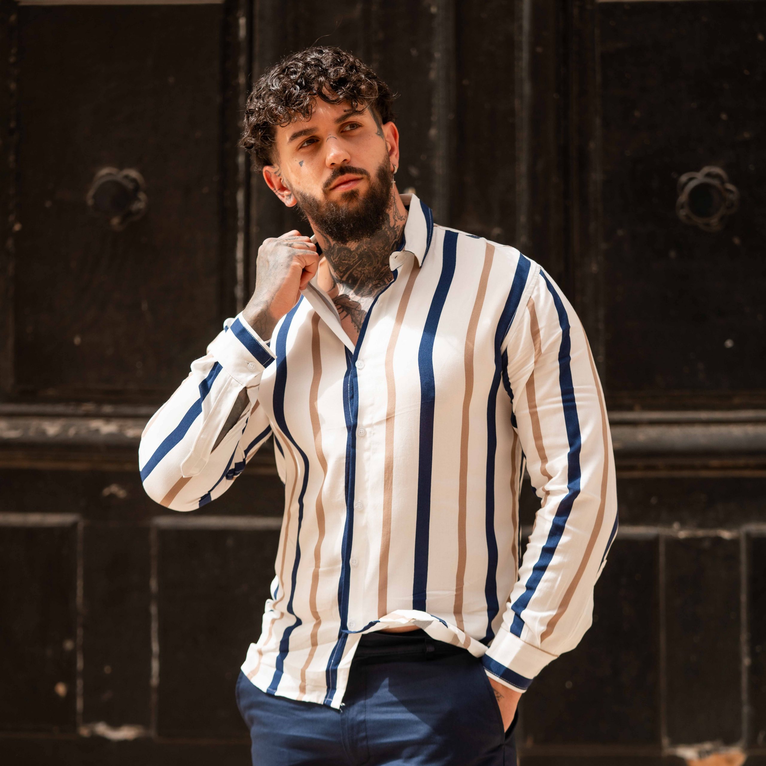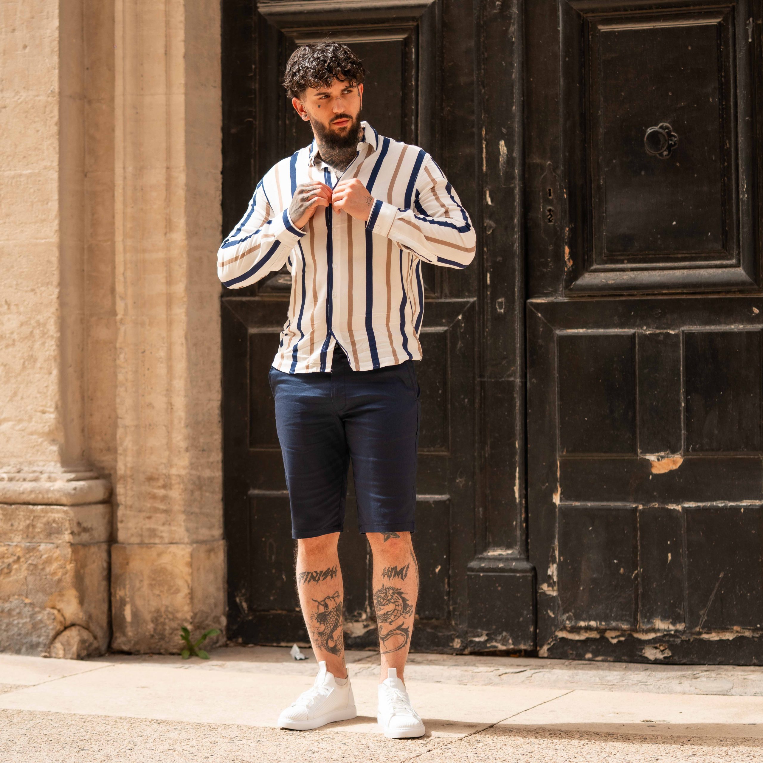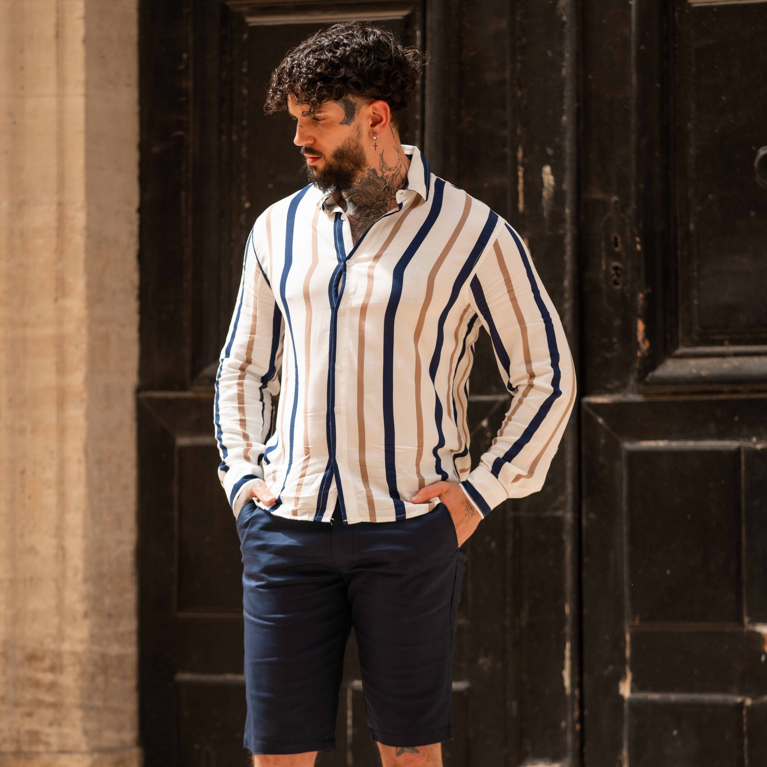 Découvrez notre chemise à rayures élégante, parfaite pour ajouter une touche de sophistication à votre garde-robe estivale. Confectionnée dans un tissu léger et respirant, cette chemise arbore des rayures verticales audacieuses en bleu marine et beige sur un fond blanc, offrant un look moderne et raffiné. La coupe ajustée met en valeur la silhouette tout en garantissant un confort optimal. Les manches longues avec poignets boutonnés et le col classique ajoutent une touche de formalité, ce qui rend cette chemise idéale aussi bien pour des occasions décontractées que pour des événements plus habillés. Associez-la à un short en toile bleu…