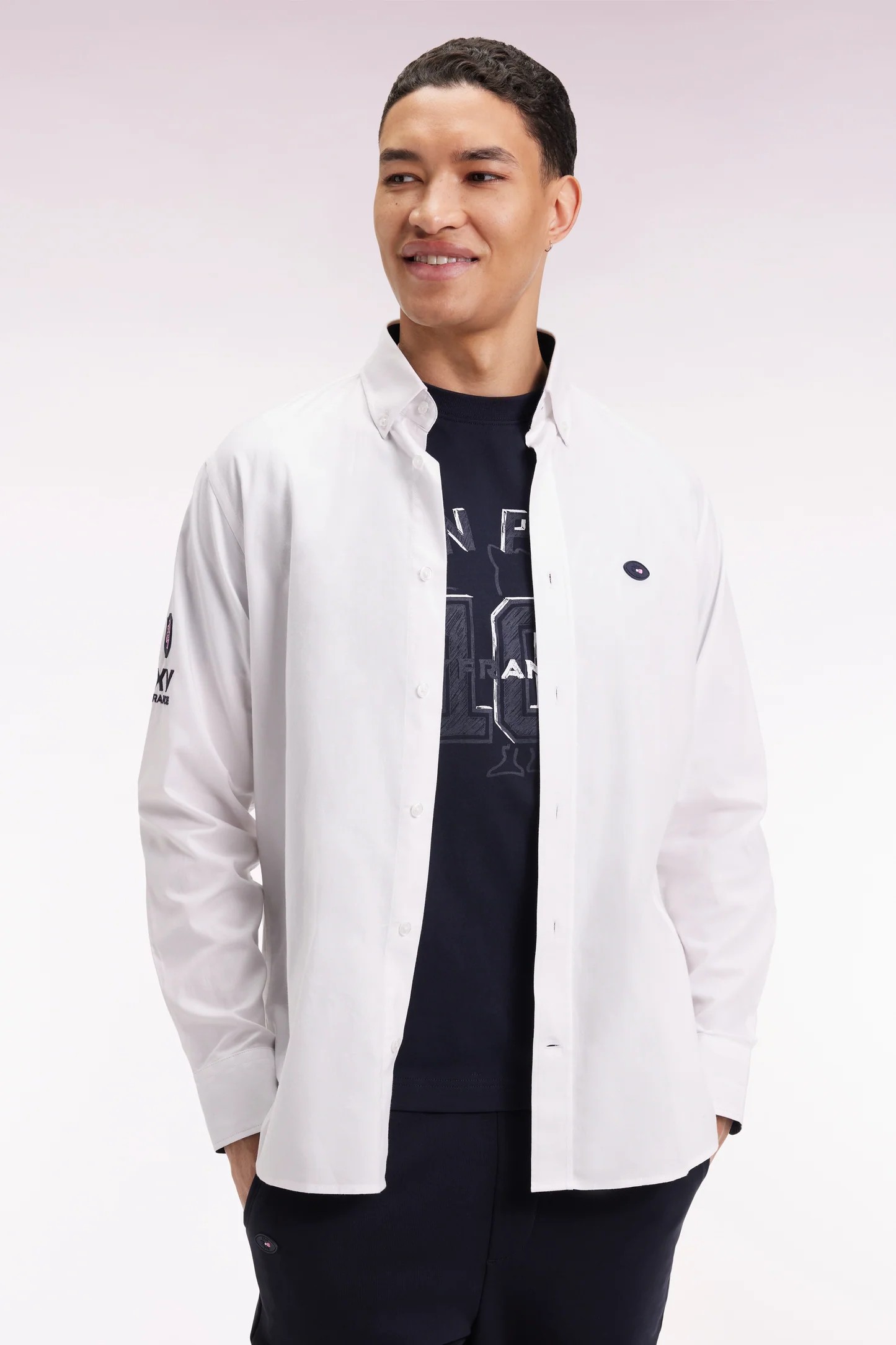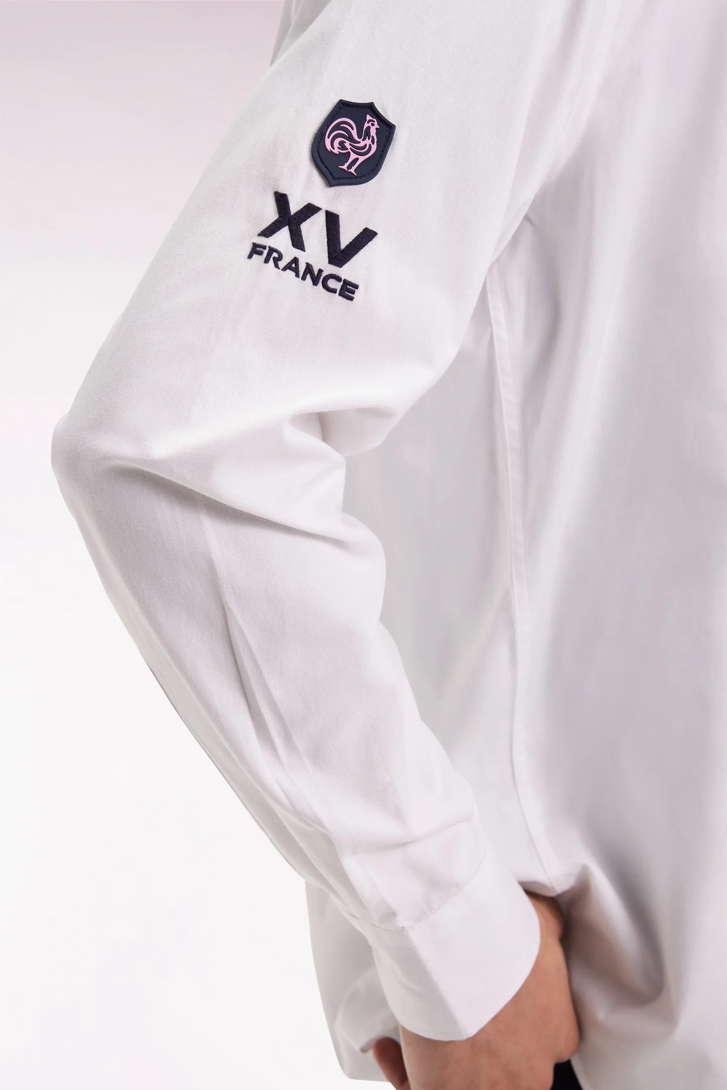 Description Inspirée de l’héritage rugby de notre maison française, cette chemise masculine e coton pinpoint blanc mise sur des détails hommage au XV de France pour affirmer son caractère sans sacrifier son raffinement. Déclinée dans une coupe droite regular, promesse de confort, elle se distingue par sa broderie dos rehaussée d’un tissus cravate à l’imprimé exclusif, sa broderie manche XV de France et ses finitions soignées Un modèle sport-chic, à porter seul ou ouvert sur un T-shirt des tribunes à la ville Coupe droite Regular Bas arrondi Col à pointes boutonnées Badge poitrine silicone nœud papillon Broderies manche XV de…
