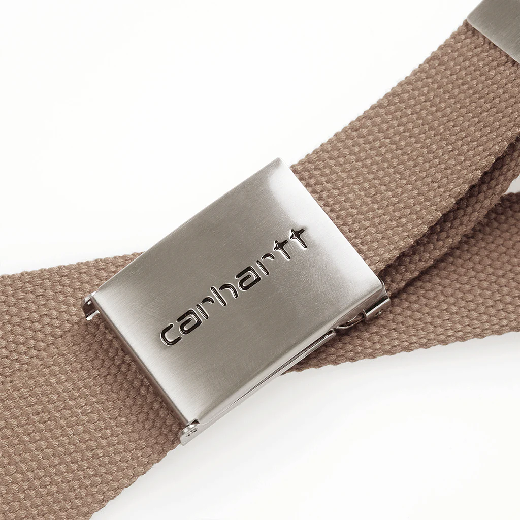 Dans sa collection d’indispensables, Carhartt présente sa ceinture à boucle interchangeable et gravé du script.