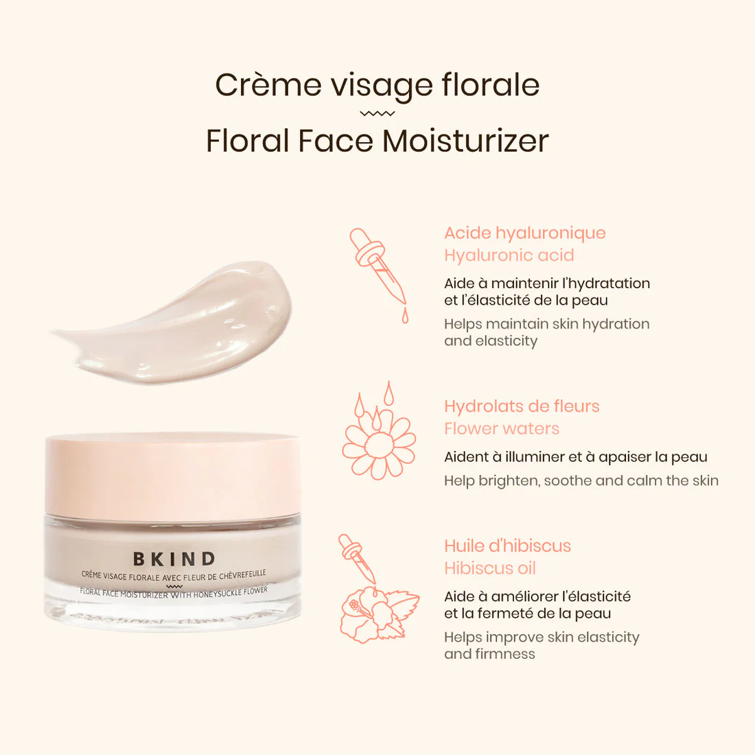 Formulée avec des hydrolats de fleur d’oranger et de géranium, notre crème visage florale offre une bonne dose d’hydratation tout en apaisant et en régénérant la peau. Enrichie en acide hyaluronique, huile d’hibiscus, huile de rose musquée, extrait de fleur de chèvrefeuille et huile d’abricot, cette crème légère aide à illuminer le teint, améliorer l’élasticité de la peau et la nourrir en profondeur.
