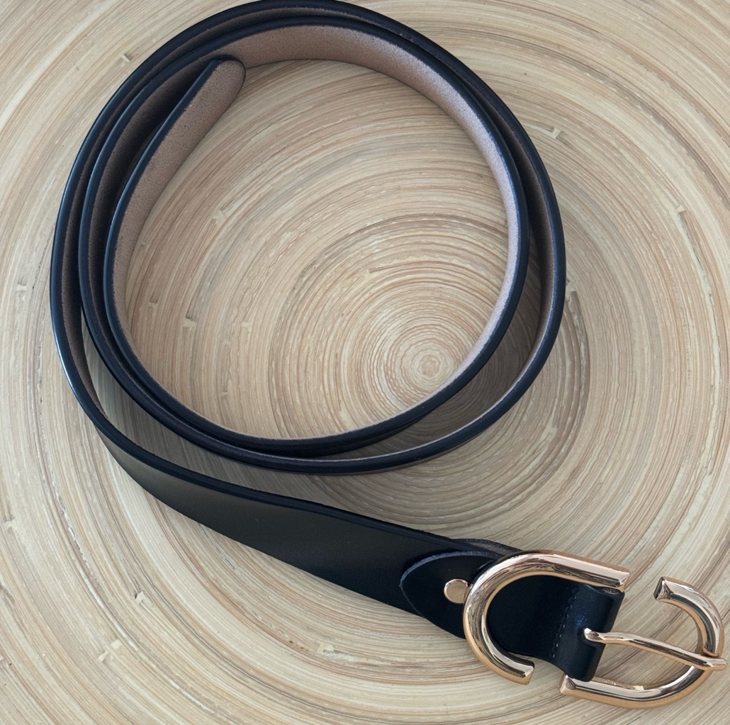 Ceinture cuir noire avec boucle métal doré. Longueur : 95 cm avec possibilité de la racourcir.