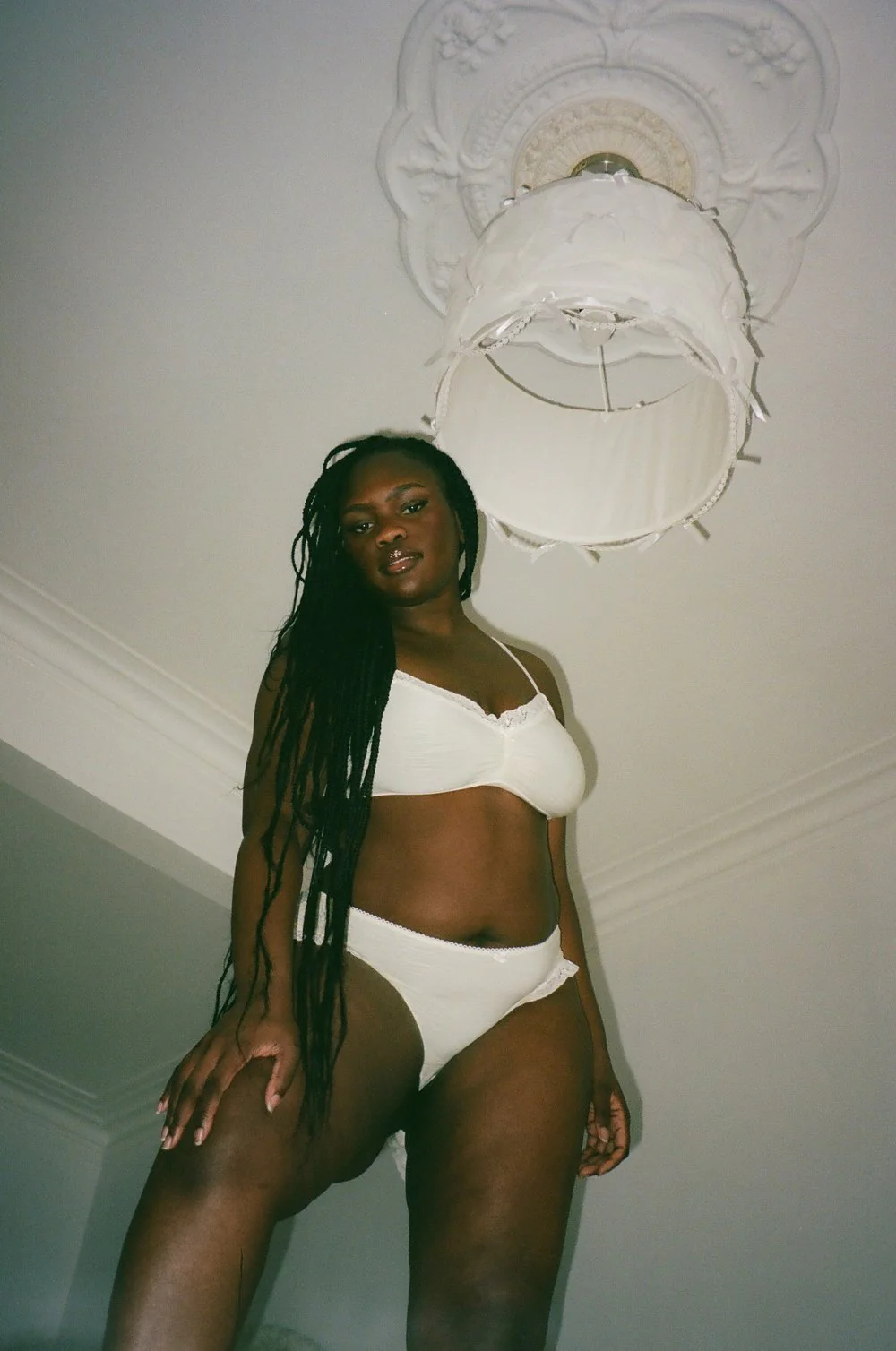 La culotte Madeline – une culotte intemporelle, coquine et sexy, avec des détails en dentelle à volants, une bordure élastique et finie avec un joli petit nœud. Cette culotte est d’un jaune pastel texturé et extensible. La mannequins porte la taille XL.