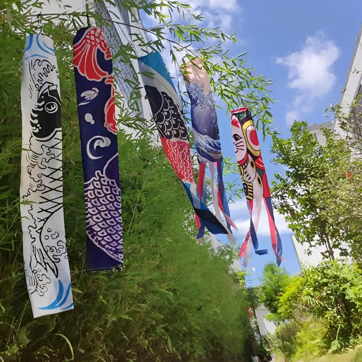 Les Fukinagashi Koinobori, des carpes koï symboliques, sont accrochées pour la fête des enfants (Kodomo no Hi) au Japon. Elles symbolisent la force et la persévérance, apportant des souhaits de bonheur et de succès.