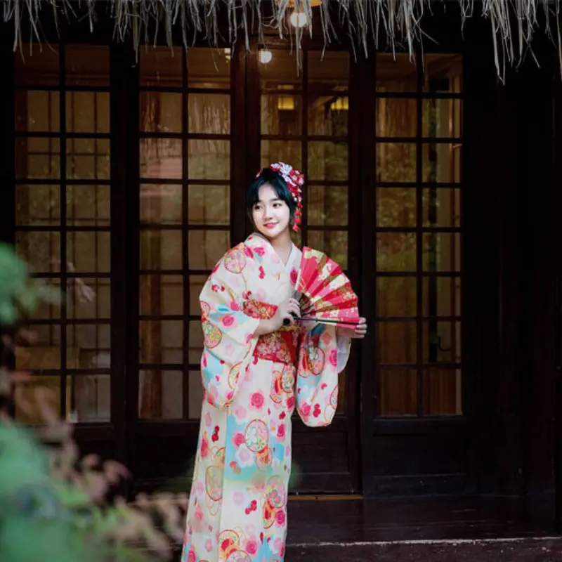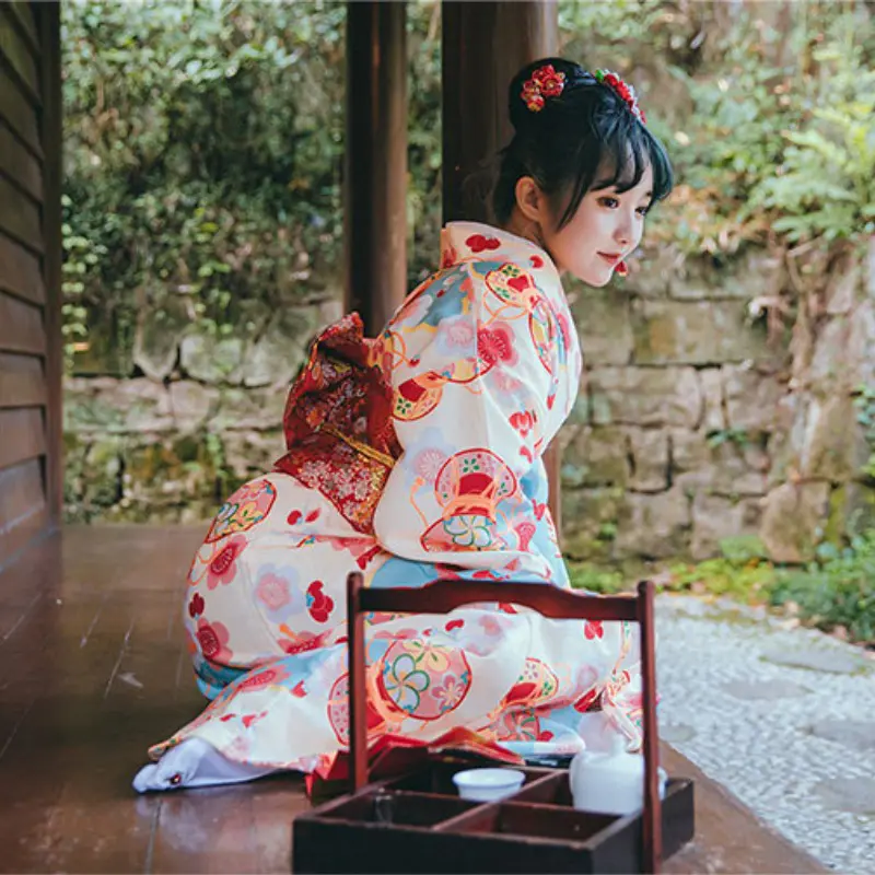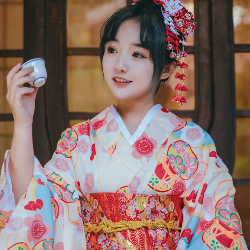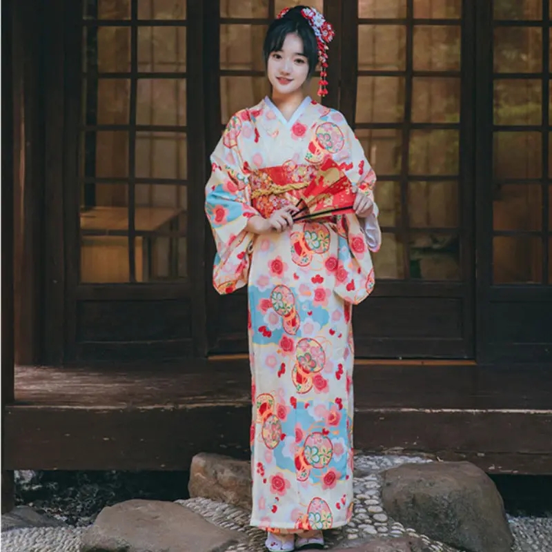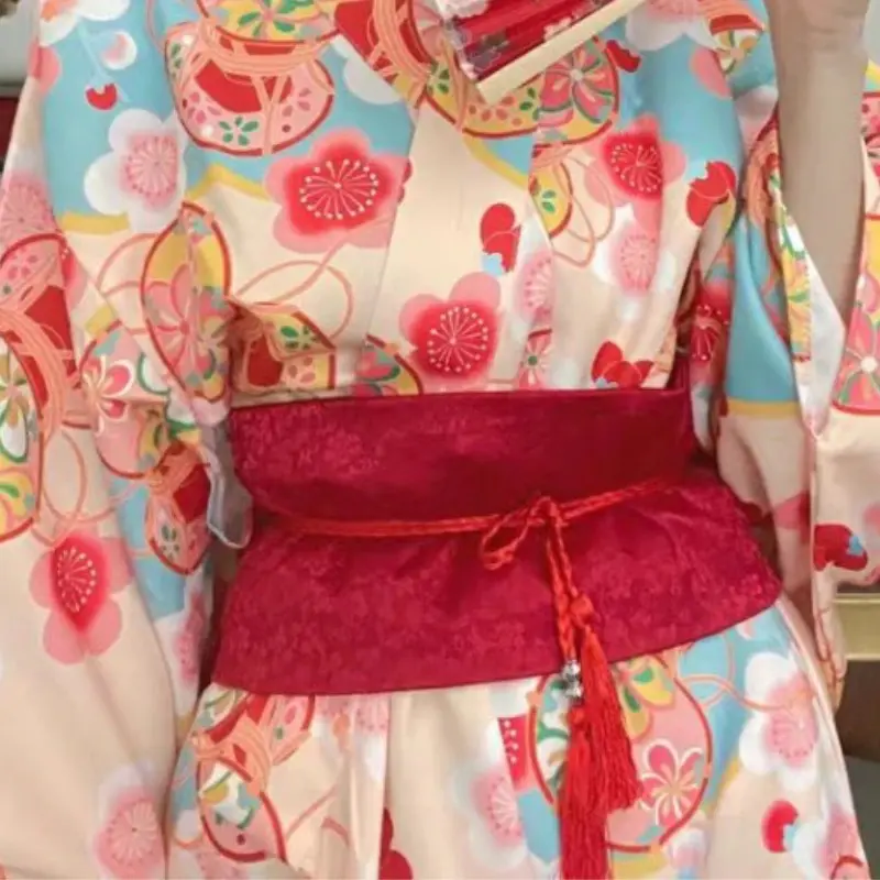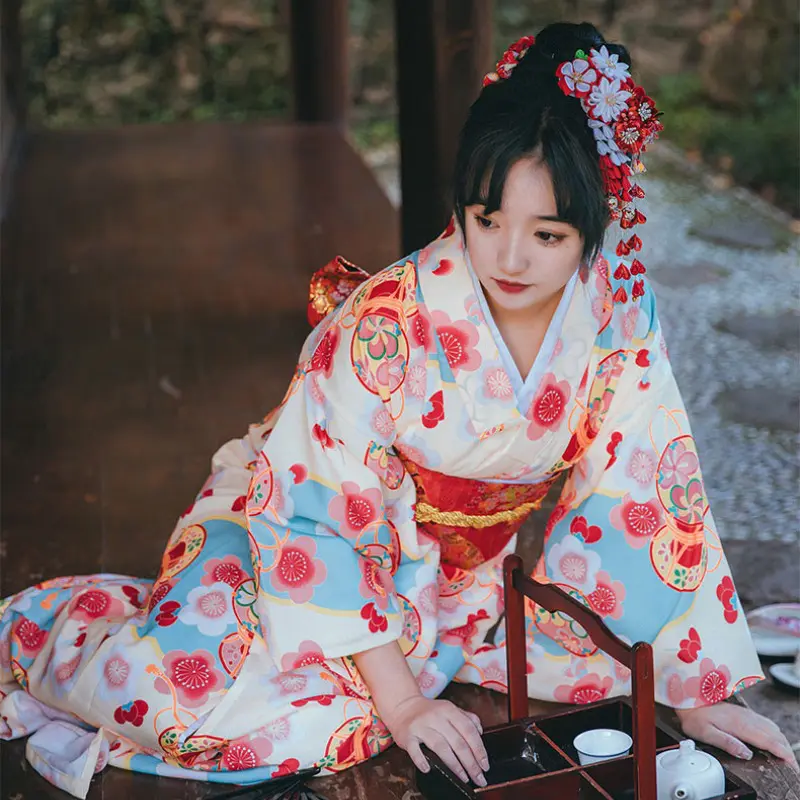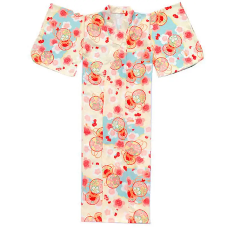 Kimono traditionnel pour femme motif fleurs de prunier Matière : polyester Design : fleur de prunier (ume) Tailles : taille unique – kimono adapté aux personnes entre 45-68 kg Ceinture obi rouge incluse (sans noeud)