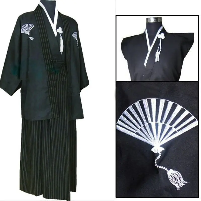 Kimono noir traditionnel japonais pour homme Ensemble veste, jupe et haut de kimono Matière : polyester Tailles : S, M, L (voir guide des tailles) Kimono également disponible en beige