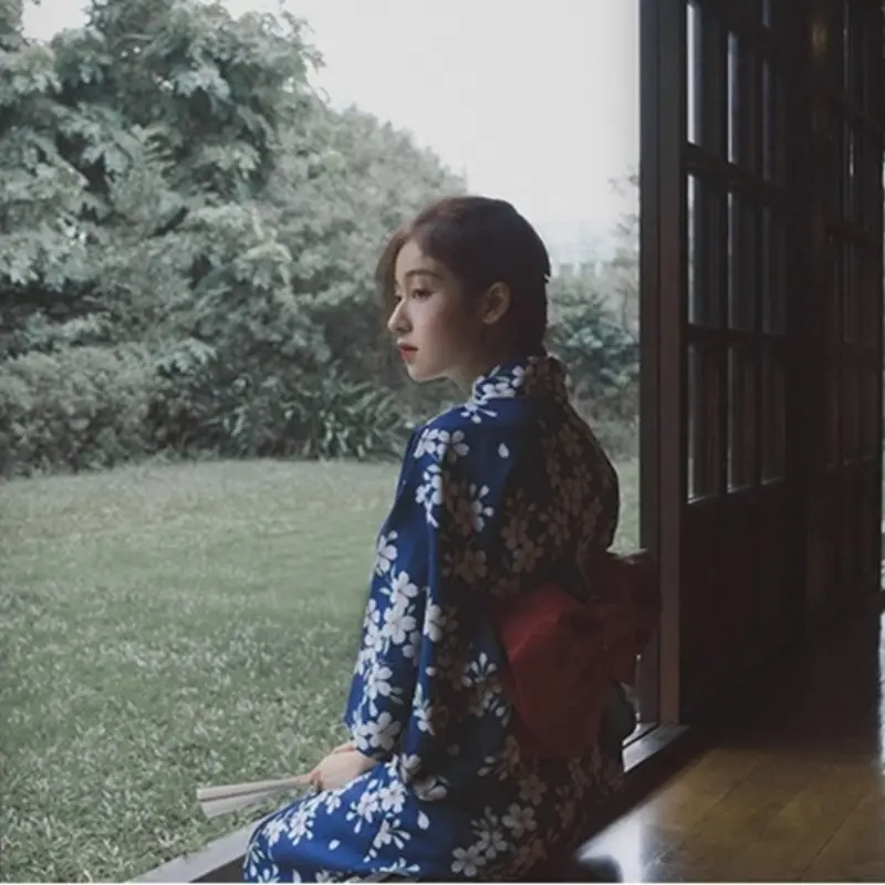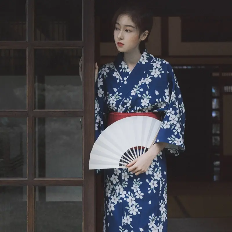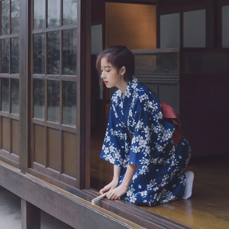 Kimono traditionnel japonais pour femme motif floral Matière : polyester Design : sakura Taille unique – kimono pour les personnes entre 45 – 68 kg Ceinture obi incluse (sans noeud)