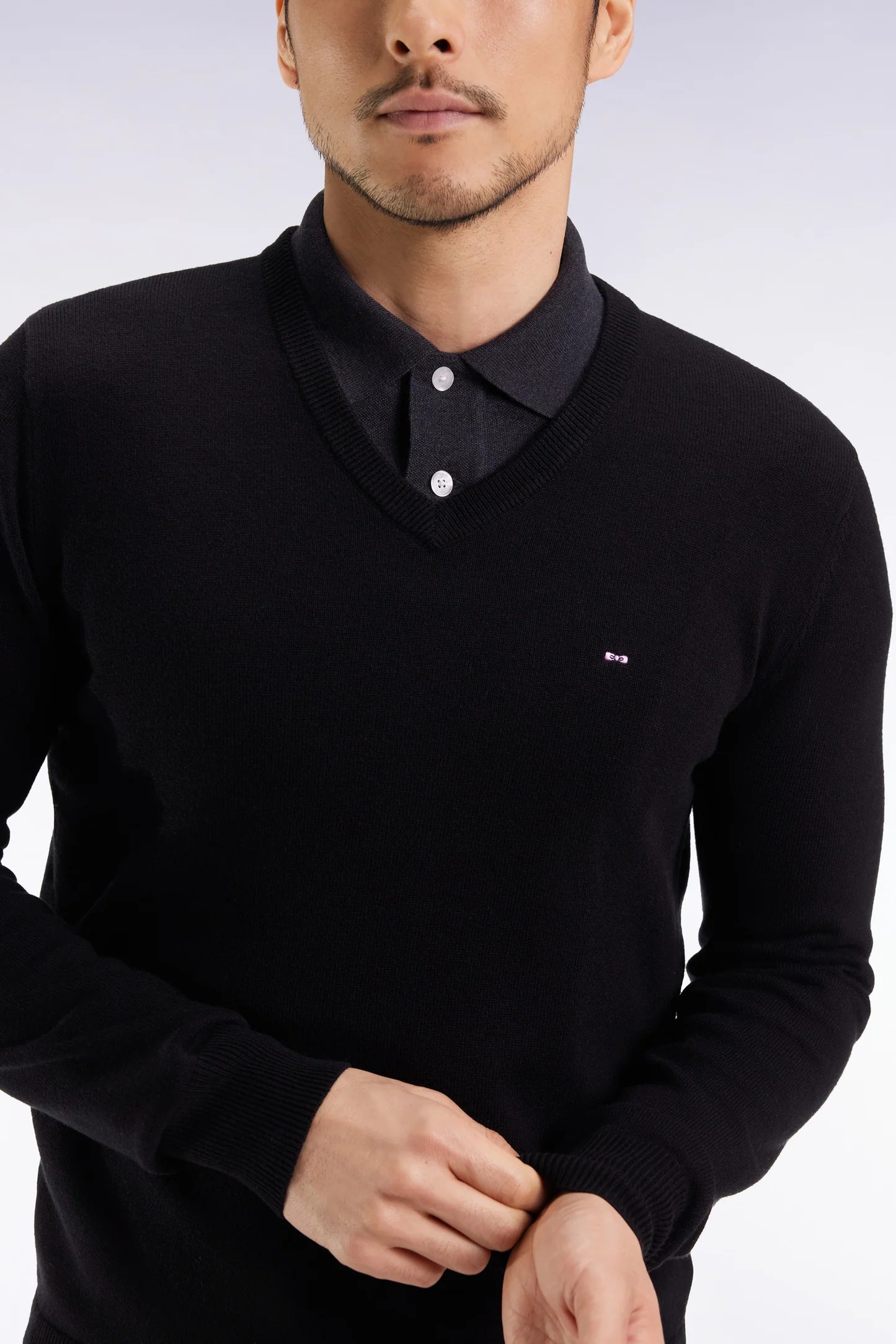 Description Cet élégant pull col V en laine et coton mélangés reprend la coupe droite confortable et polyvalente de notre pull classique décliné dans plusieurs propositions se distinguant par leur encolure. Ce modèle se pare de notre emblématique broderie nœud papillon sur la poitrine et d’une demi-lune intérieure à rayures rugby. Parfait pour dynamiser une silhouette avec une touche de couleur maîtrisée grâce au large choix de coloris proposés ici Coupe Regular droite Col V Broderie poitrine nœud papillon Finitions bords-côtes Demi-lune intérieure rayée Contient des parties non textiles d’origine animale Composition et entretien Composition et entretien 55% LAINE, 45%…