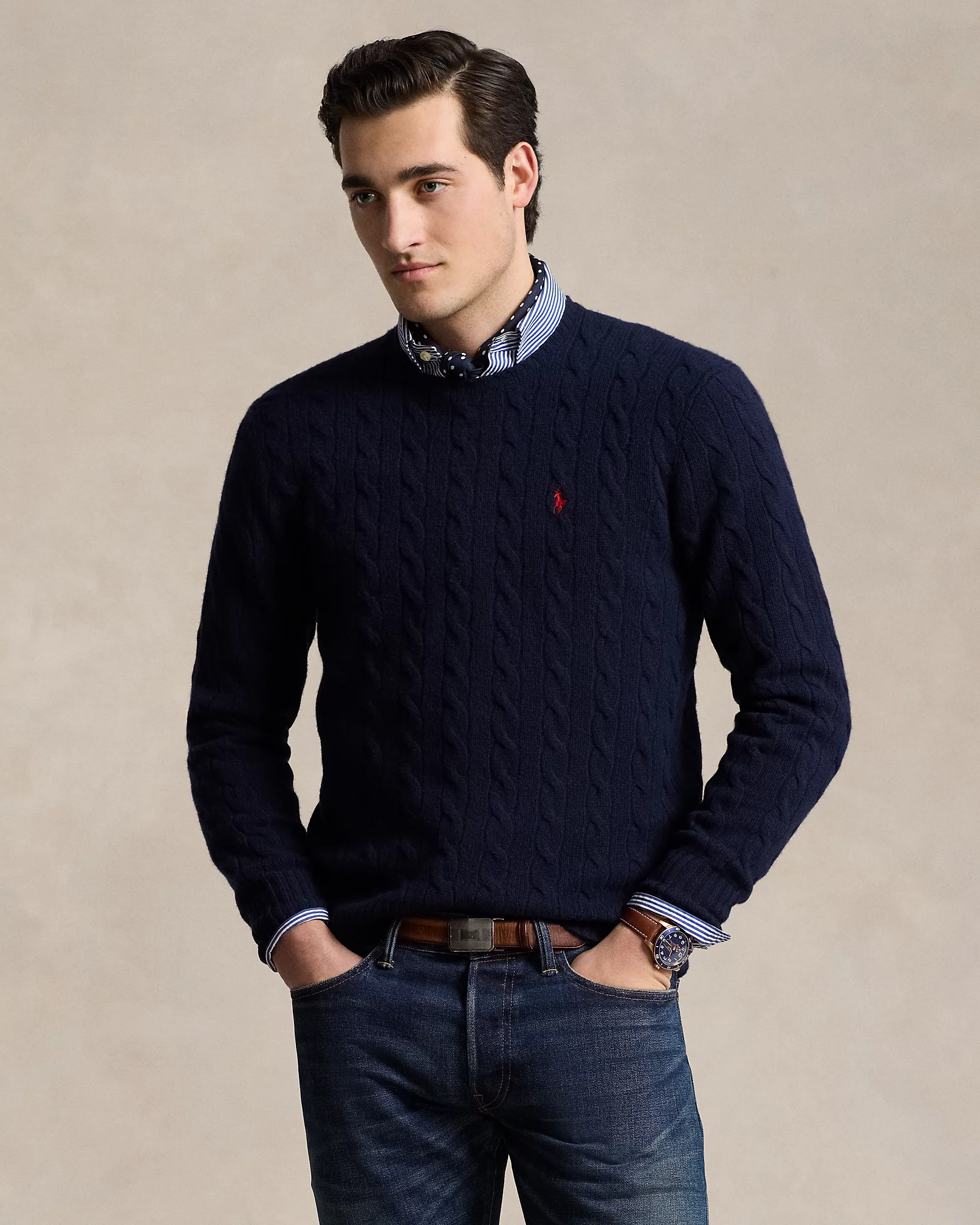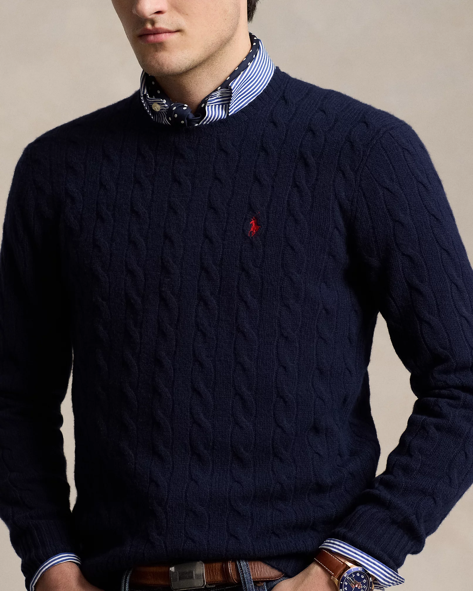 Cette interprétation de notre emblématique pull en tricot torsadé est confectionnée dans un fil de laine italien tissé avec du cachemire. Détails Regular Fit : plus large au niveau de la poitrine, tout en conservant une silhouette moderne. Taille M : longueur de corps (avant et arrière) de 67,9 cm, épaules de 45,7 cm, tour de poitrine de 105,4 cm et longueur de manche de 64,1 cm. La longueur de manche varie de 1,3 cm d’une taille à l’autre. Col rond. Manches longues avec poignets côtelés. Ourlet côtelé. Poney distinctif brodé sur la poitrine à gauche. 90 % laine, 10 % cachemire. Lavage à la main ou nettoyage à sec.…