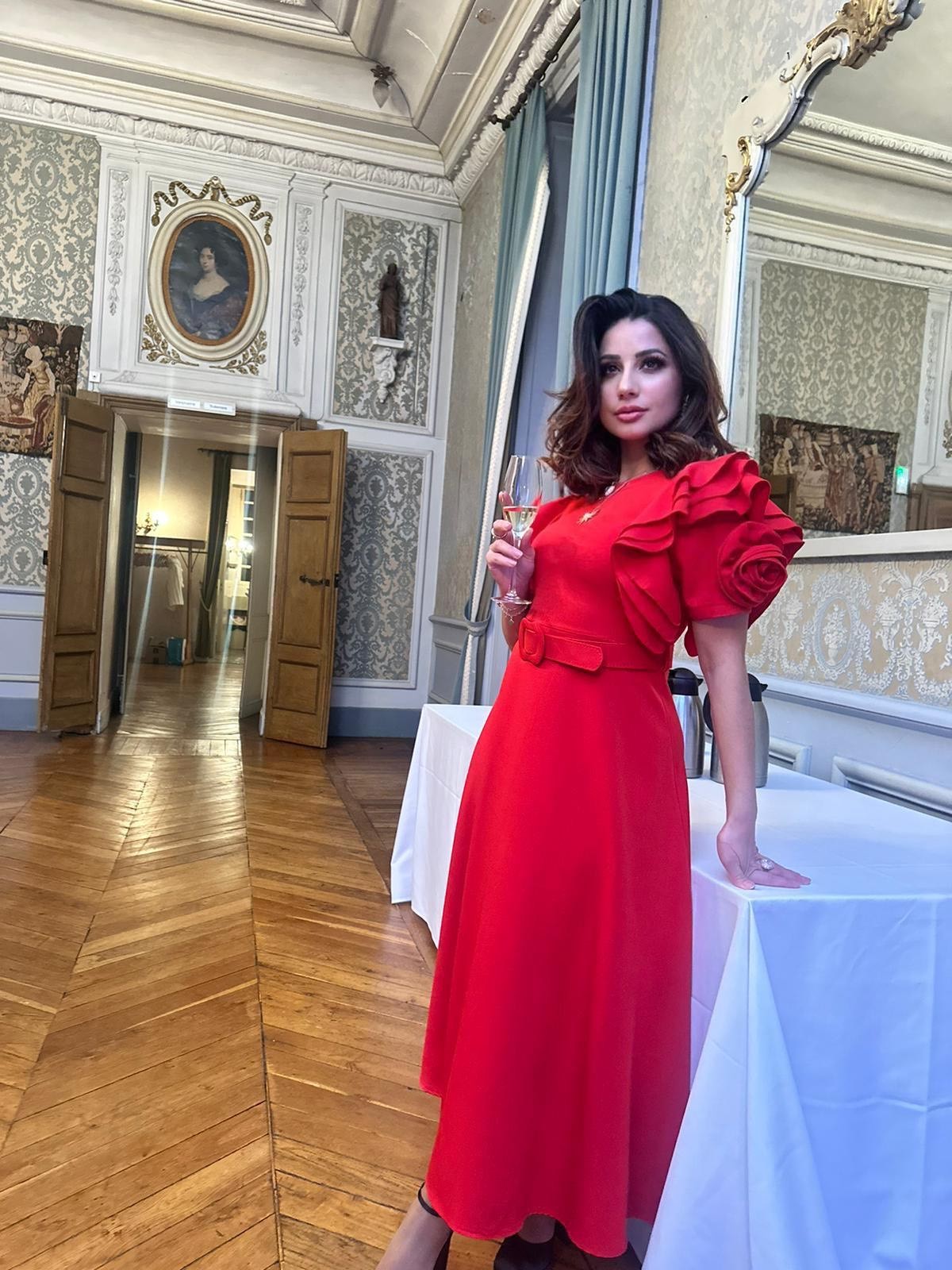 Cette robe midi rouge vif, avec son élégante coupe cintrée à la taille, est idéale pour les occasions spéciales. Les manches sont ornées de fleurs en relief, ajoutant une touche sophistiquée et féminine.