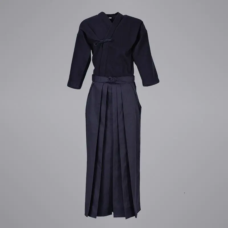 Tenue Kendo pour homme incluant un Keikogi & un hakama Ensemble comprenant un haut (Keikogi), et un hakama japonais Matière : coton + polyester Tailles : 3XS à 4XL (guide des tailles disponible) Couleur : bleu marine ou blanc