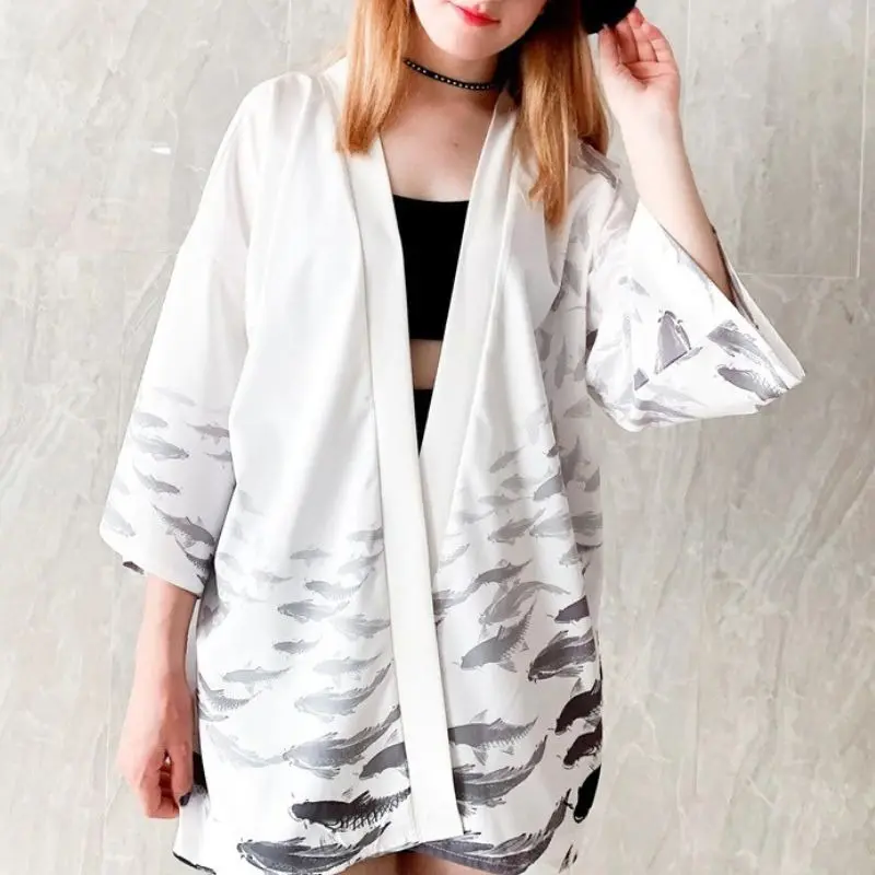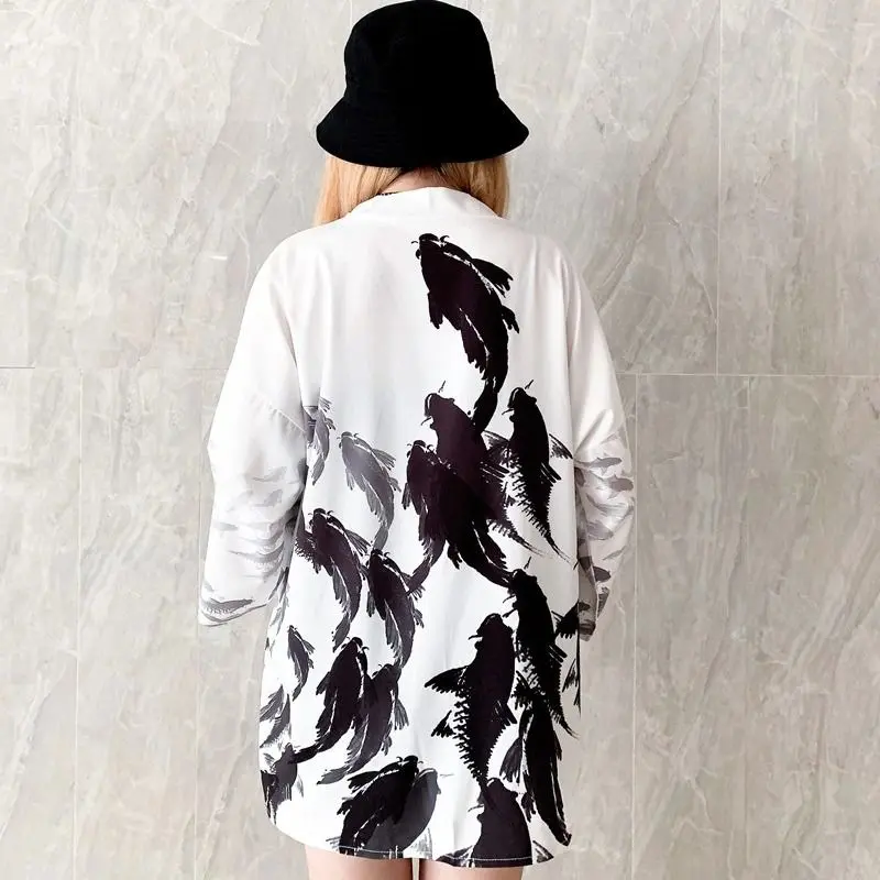 Veste kimono femme avec un banc de poissons koï Fabrication à base de : polyester Impression : poissons koï Taille : Taille unique (guide des tailles disponibles sous le bouton "ajouter au panier") Tissu à séchage rapide, et léger Entretien : retourner, puis nettoyer à moins de 30°C (ne pas utiliser de sèche linge)
