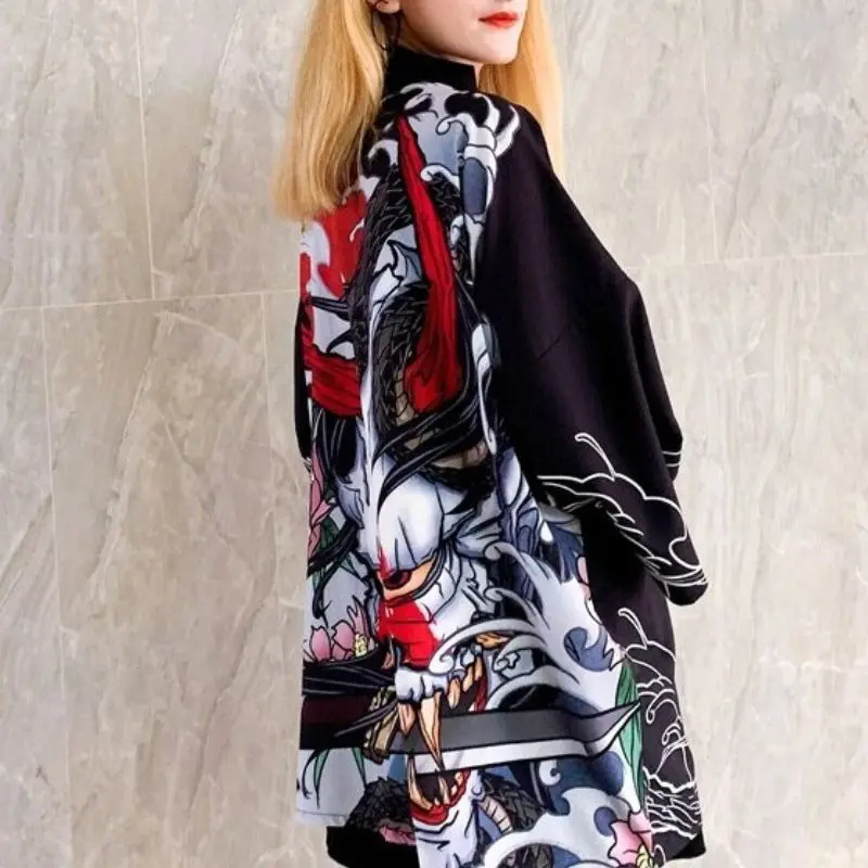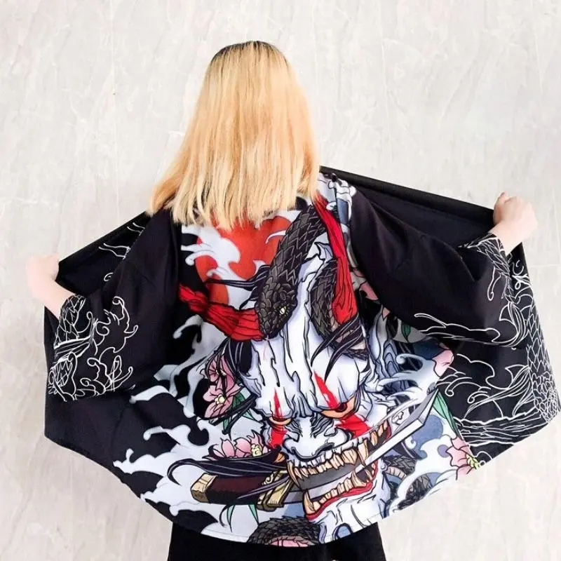Veste kimono femme avec motif Hannya Matière : polyester Imprimé : Hannya Tailles : Taille unique (voir guide des tailles sous le bouton « ajouter au panier ») Tissu léger, et très doux Entretien : nettoyage à l’envers à moins de 30°C (ne pas utliser de sèche linge)