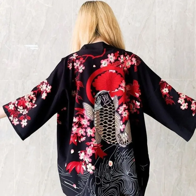 Veste kimono femme avec motif de carpe Koï et Kiku