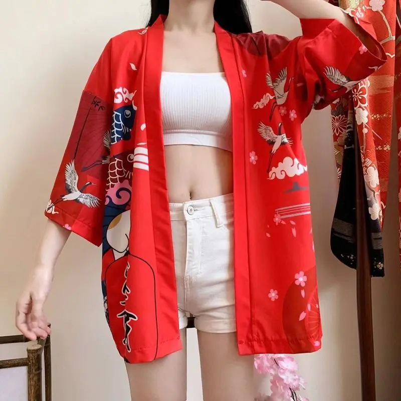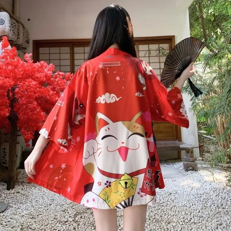 Veste kimono femme avec motif maneki neko Matière : polyester Design : maneki neko Taille : Taille unique (guide des tailles disponibles sous le bouton "ajouter au panier") Tissu léger, et agréable à porter Astustes entretien : retourner le kimono, puis laver à une température inférieure à 30°C (sèche linge non recommandé)