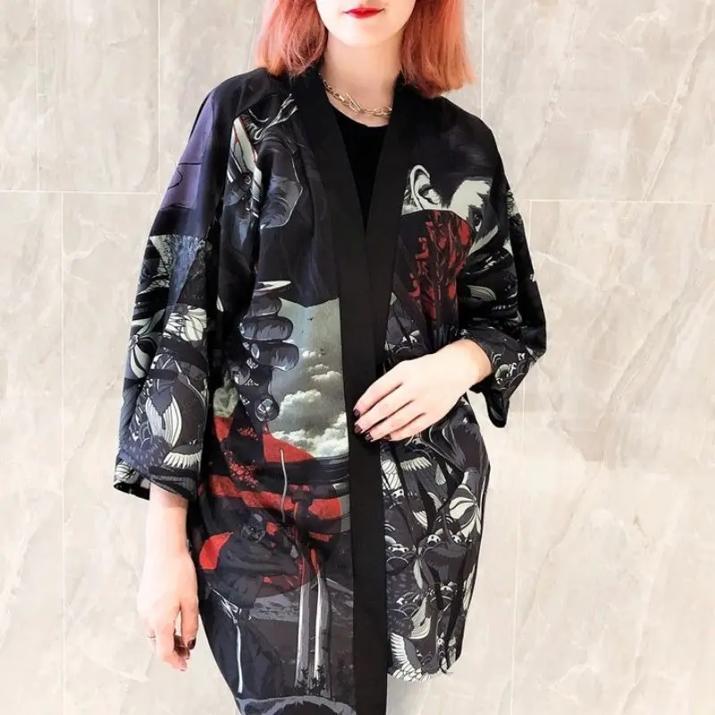 Le motif Onna Bugeisha est un motif populaire pour les vestes de kimono pour femmes. Ce motif complexe et élégant a été conçu pour symboliser les guerrières japonaises connues sous le nom d’Onna Bugeisha. Le motif consiste en une combinaison frappante de Torii, de grues, de poignards et d’autres symboles liés à l’histoire de l’humanité.