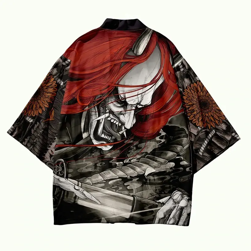 👹 Motif Hannya 💯 Polyester de haute qualité 🎋 Manches courtes et larges 📏 Tailles de M à XXL
