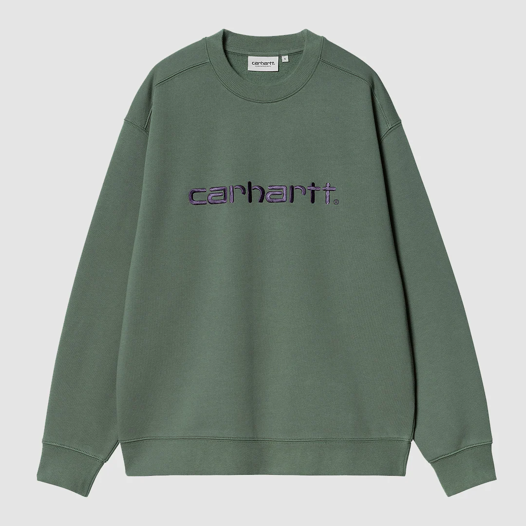 Automne Hiver 24–Sweat-shirt ‘Carhartt’ Duck Green/Aura en jersey épais, rendu molletonné.Coupe regular, Script Logo sur la poitrine.–100 % Coton