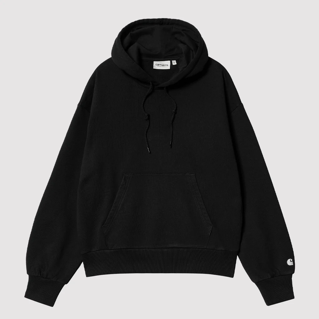 Carhartt WIP propose ici, son indémodable sweat à capuche (ajustable) avec sa poche kangourou. On retrouve également le logo brodé en argenté au niveau de poignet de la manche gauche.